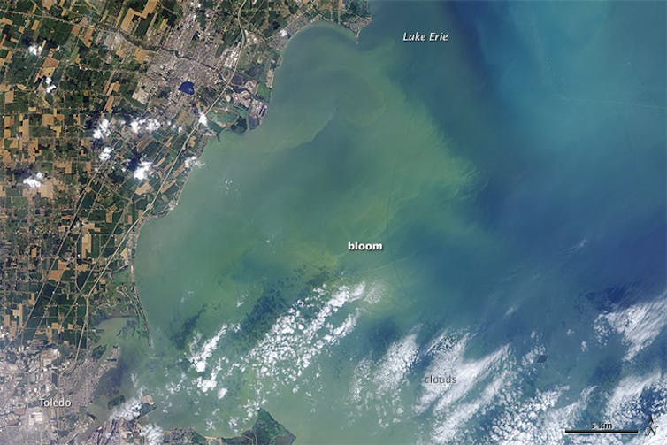 Residents of Toledo, Ohio were unable to use tap water for three days in August 2014 after this harmful algae bloom on Lake Erie contaminated the water with a toxin harmful to humans.