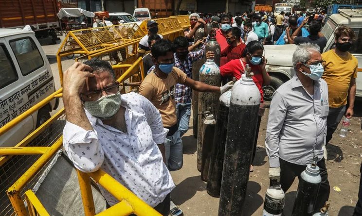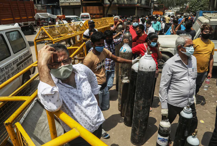 Family members of COVID-19 infected patients stand in a queue with empty oxygen cylinders outside the oxygen filling centre in New Delhi, India.