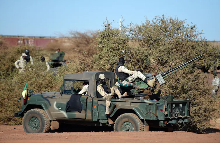 Armed and Security Forces of Mali servicemen stand guard on a military vehicle.