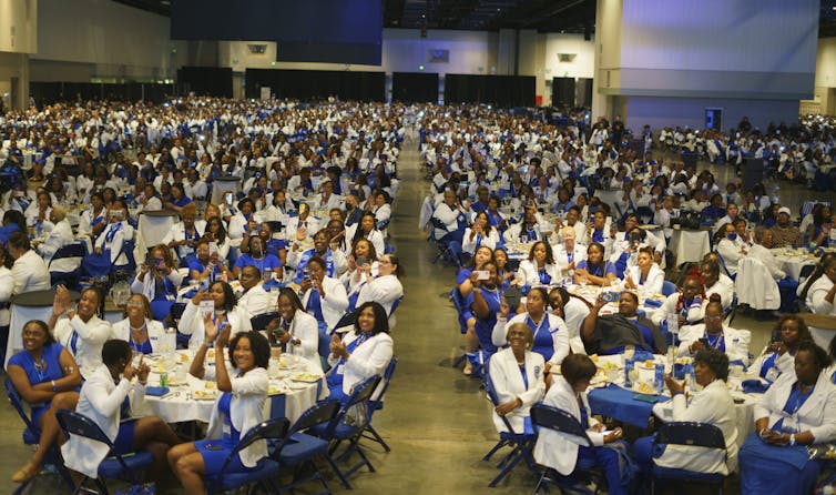 Sorority members listen as U.S. Vice President Kamala Harris gives the keynote speech at the Zeta Phi Beta Grand Boulé in Indianapolis on July 24, 2024.