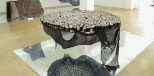 The first artwork the visitor encounters is composed of koroboi lamps, commonly used for lighting homes. Mwangi grew up with these homemade kerosene lanterns. For him they represent the light of individualism in a capitalist world. The koroboi lamps on the show are not lit, though, also a statement. Using kerosene as fuel is a health hazard and bad for the environment. For him, fossil fuel use reflects a lack of collective responsibility in Kenya.