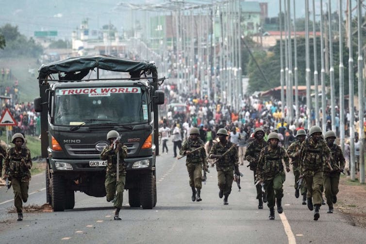 Protesters in Kisumu confront police officers after Kenya’s disputed 2017 elections.