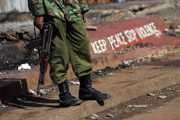A Kenyan policeman stands next to a painted sign reading “keep peace stop violence” during protests in Nairobi in 2008.