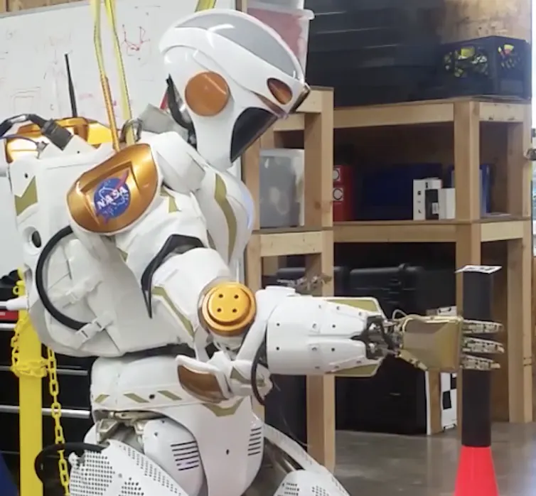 A NASA Valkyrie robot picks up an item with its hand.