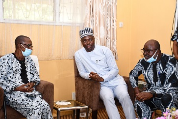 Oyo State Governor, Engr Seyi Makinde (middle); former Vice Chancellor, University of Ibadan, Prof A B O O O Oyediran (left) and his son Olumide Oyediran during the governor’s condolence visit to Prof Oyediran over the death of his wife and Chairman, African Newspaper of Nigeria Plc (Publishers of Tribune titles), Revd (Mrs) Omotola Oyediran in Ibadan. PHOTO: Oyo State Govt.