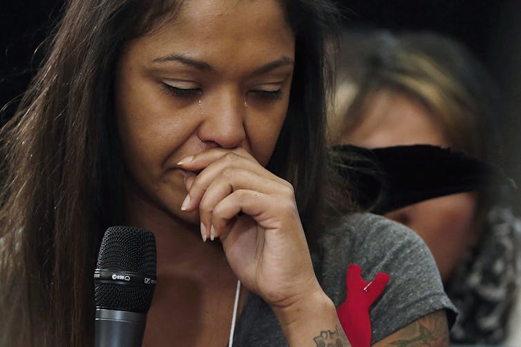 Isabel Daniels weeps as she speaks of her murdered cousin, Nicole Daniels, at the opening day of hearings at the National Inquiry into Missing and Murdered Indigenous Women and Girls in Winnipeg in October 2017.