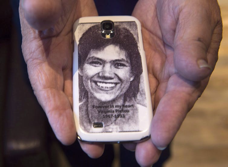 Robert Pictou, father of Virginia Pictou Noyes, displays a photo of his daughter as he attends the National Inquiry in Membertou, N.S. in Oct. 2017.