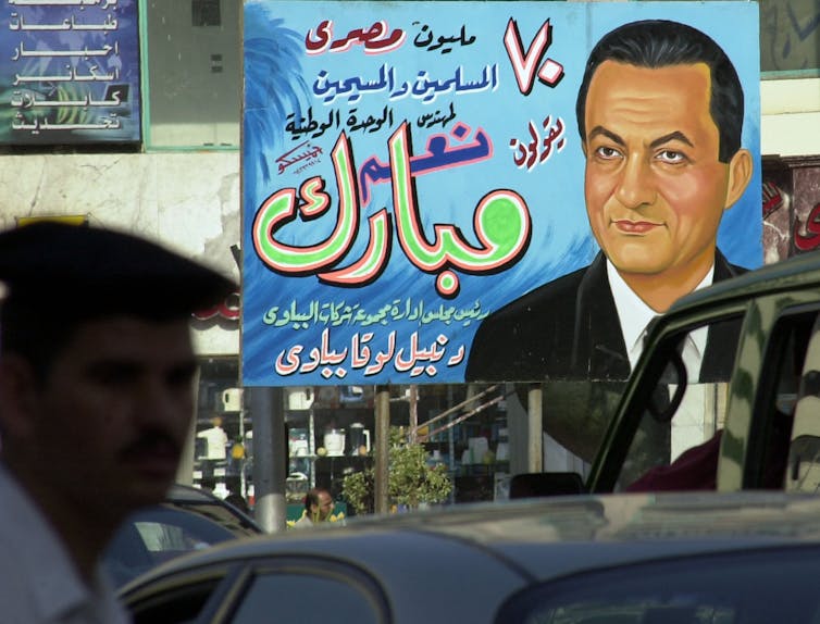 A 2005 presidential election poster of then-President Hosni Mubarak that said: ‘70 million Egyptian Muslims and Christians say yes to Mubarak.’