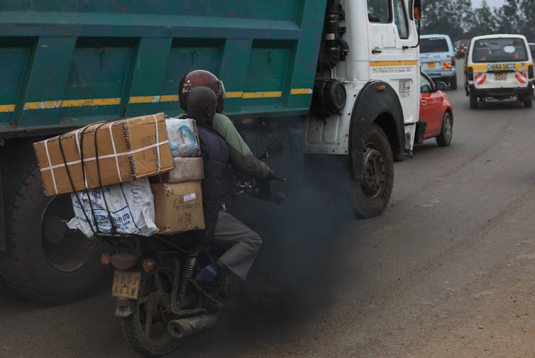 Black exhaust fumes from lorry envelope a motorcyclist and his passenger on a busy road in the Kenyan capital, Nairobi.