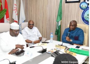 The NDDC Managing Director, Dr Samuel Ogbuku, (right) speaking during a courtesy visit by a delegation from to the Industrial Training Fund, ITF, led by the Director General, Dr Afiz Ogun, (left) at the Commission’s headquarters in Port Harcourt. In the middle is the NDDC executive Director, finance and Administration, Alabo Boma Iyaye.