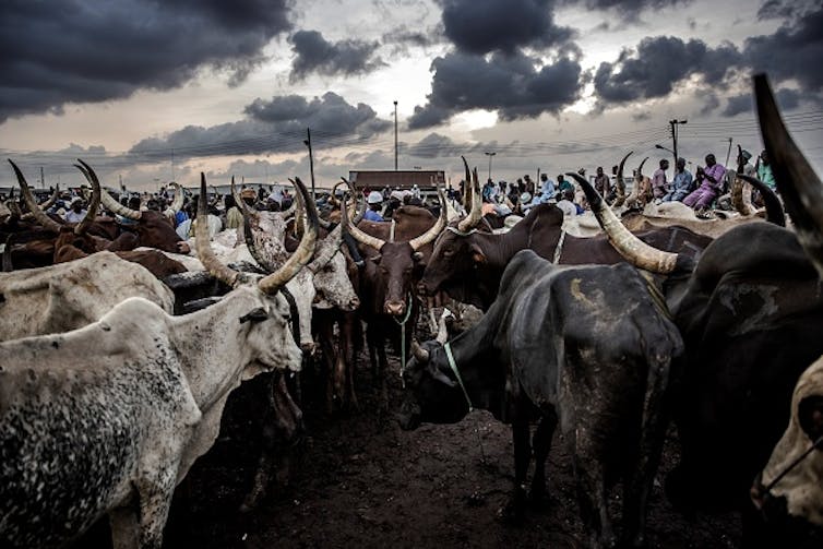 Herdsmen with their cows wait for buyers at Kara Cattle Market in Lagos, Nigeria. Veterinary services are in short supply across the country.