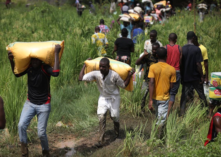 People loot bags of food from a COVID-19 palliative warehouse in Nigeria.