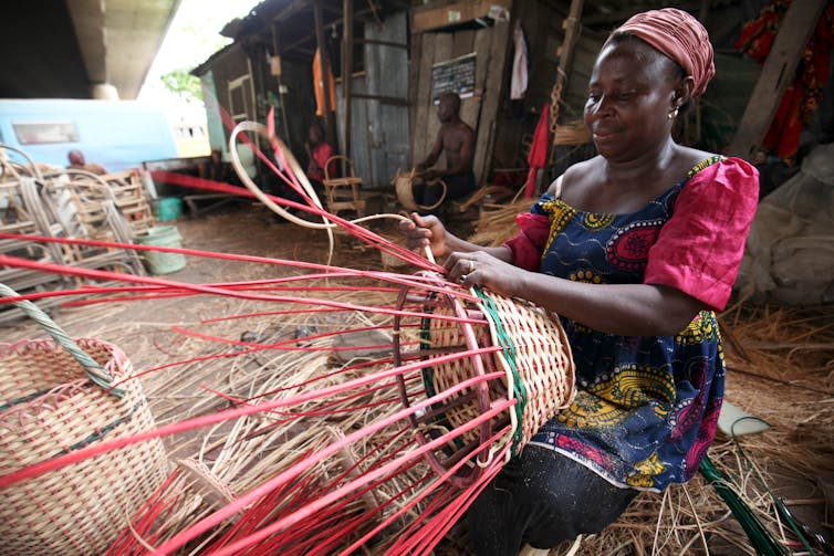A woman weaves cane sticks to produce baskets in the Maryland community in Ikeja, Lagos, Nigeria.