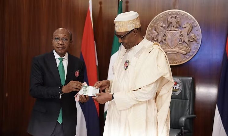 Nigerian president Muhammadu Buhari and Godwin Emefiele, the governor of the Central Bank of Nigeria, present the redesigned banknotes in Abuja.