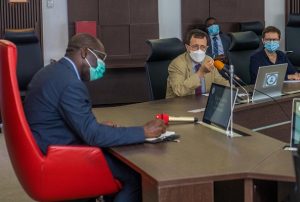 Edo State Governor, Mr. Godwin Obaseki (left); French Ambassador to Nigeria, Jerome Pasquier (right), during a courtesy visit to the governor at Government House in Benin City, on Monday, April 26, 2021.