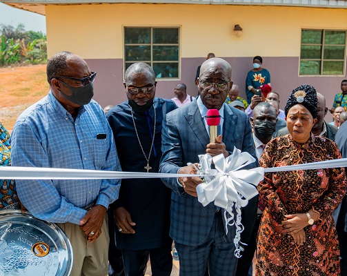 Edo State Governor, Mr. Godwin Obaseki (2nd right), with the Chairman, Edo State Chapter of the Pentecostal Fellowship of Nigeria (PFN), Dr. Mrs. Margaret Agbonifo (right), and other religious leaders during the commissioning of the prayer lodge at the PFN Headquarters in Benin City, on Monday, January 10, 2022.
