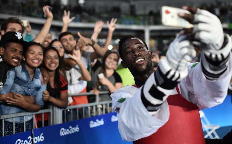 Ivorian taekwondo champion Cheick Sallah Junior Cisse takes a selfie with fans at the 2016 Olympics in Rio.