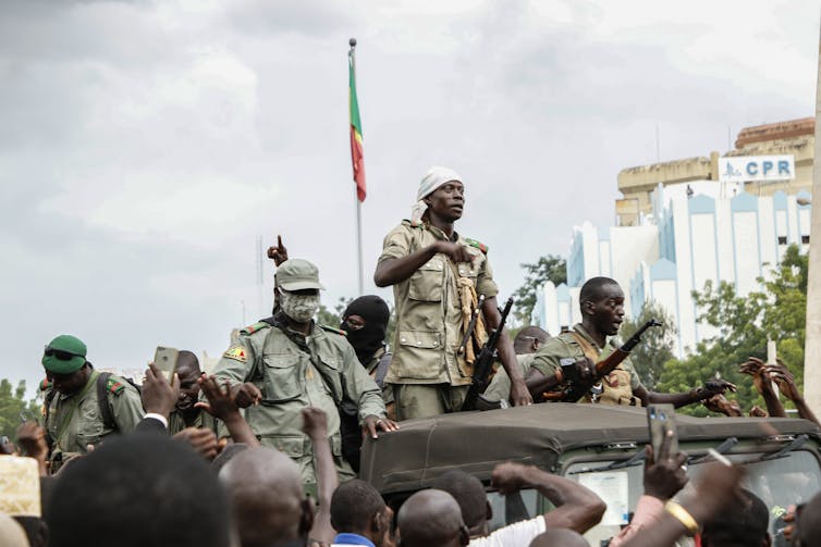 People cheer on the army in Bamako, Mali, on Aug. 21, 2020, three days after the military overthrew Mali’s president.