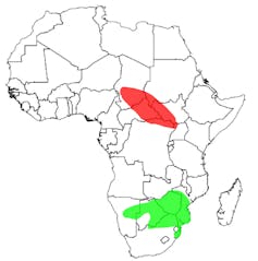 Historical distributions of the northern (red) and southern (green) white rhino.