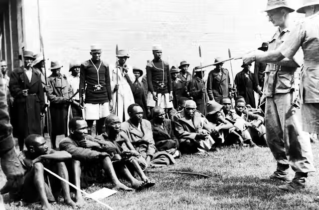 British soldiers questioning suspected members of the Kenya Land and Freedom Army near Gilgil, Kenya, on Jan. 8, 1953. (AP Photo)