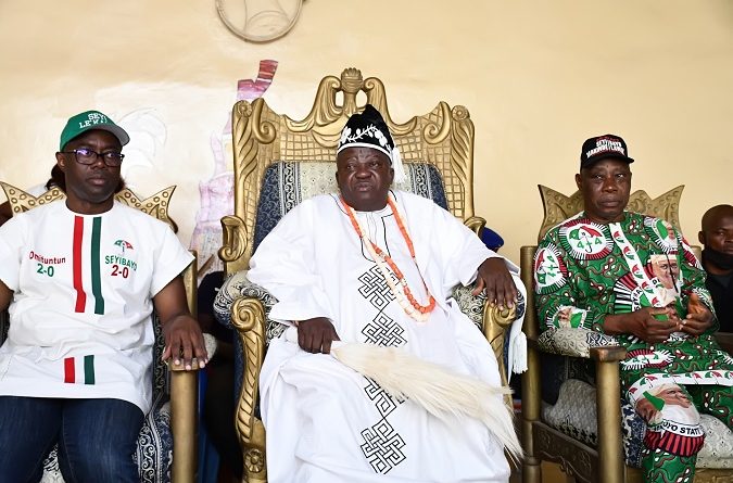From left, Oyo State Governor, Seyi Makinde; Okere of Saki Oba Kalid Olabisi and deputy governor, Barr Bayo Lawal at Okere Palace, during the campaign for second term of Governor Makinde in Saki Town, Saki West Local Government Area of Oyo State. PHOTO: Oyo Gov’s Media Unit.