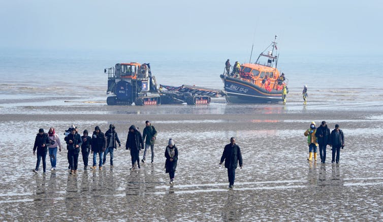 A group of migrants are guided up the beach after being brought into Kent on a lifeboat.