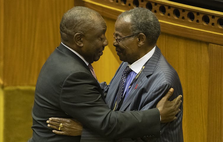 South African president Cyril Ramaphosa (L) is congratulated by leader of the Inkatha Freedom Party Mangosuthu Buthelezi (R) after being elected president of South Africa during the swearing in of new members of the National Assembly.