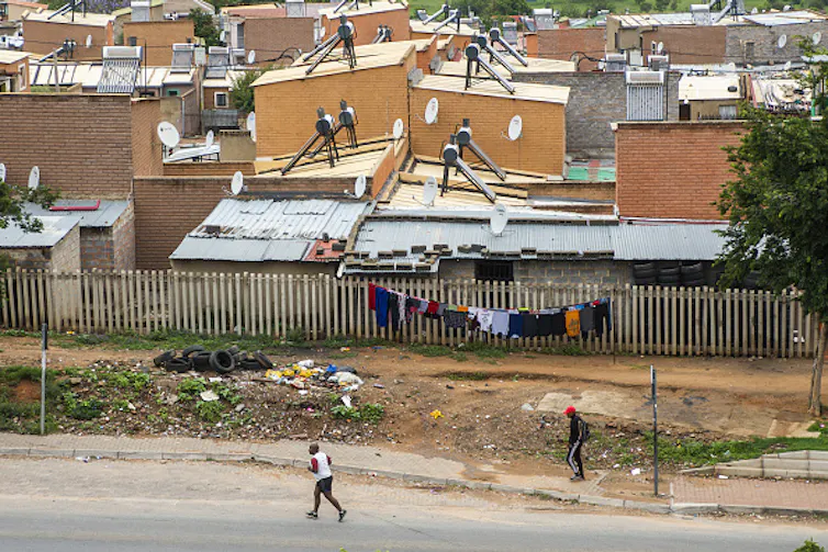 Solar powered water heaters on rooftops above shacks in the Alexandra township in Johannesburg, South Africa.