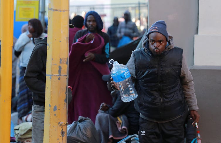 A group of refugees living on the pavement near the Cape Town Central Police Station on the first day of a national coronavirus lockdown, March 27, 2020 in Cape Town, South Africa.