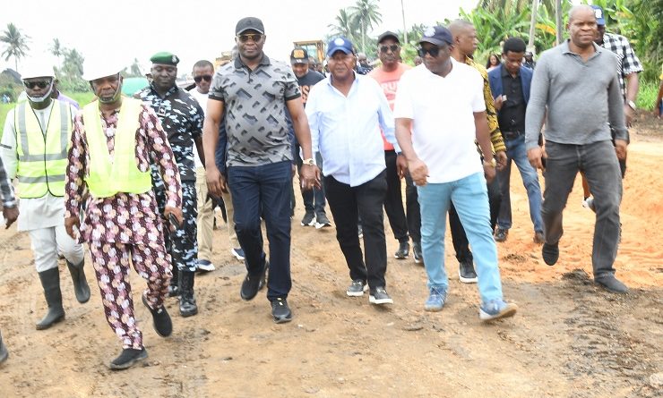 Warri-Benin sections of the East-West Road, accompanied by the NDDC Executive Director, Projects, Sir Victor Antai (second right); Delta State Representative NDDC Board. Rt. Hon. Monday Igbuya (3 rd right); the Contractor,