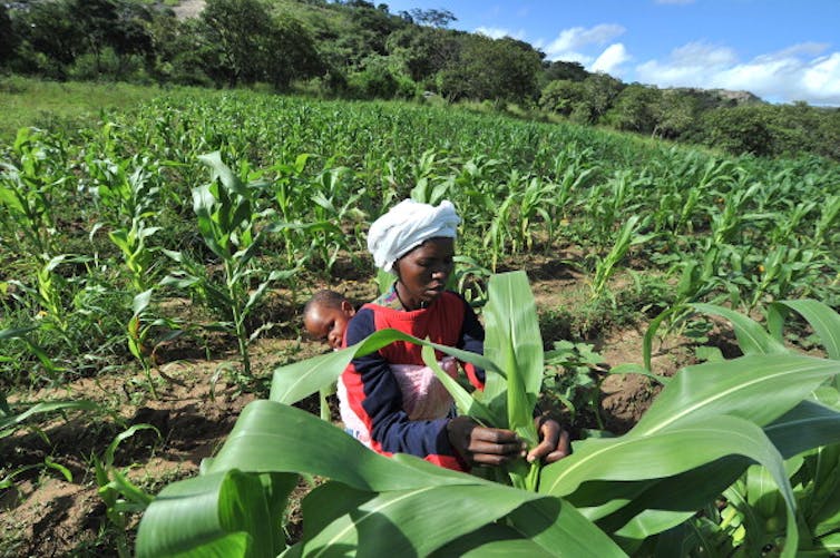 A woman checks maize crop on a small scale farm in Chinhamora, about 50 km north of Harare. ALEXANDER JOE/AFP via.