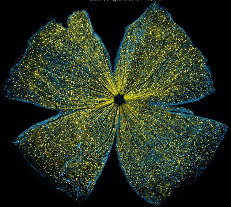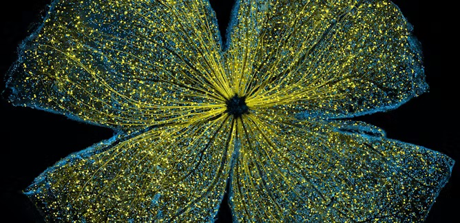 This microscopy image shows the retina of a mouse, laid flat and made fluorescent.