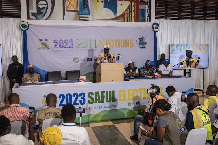 President of the Electoral Commission of Sierra Leone, Mohamed Konneh announcing partial election results in Freetown on June 26, 2023.