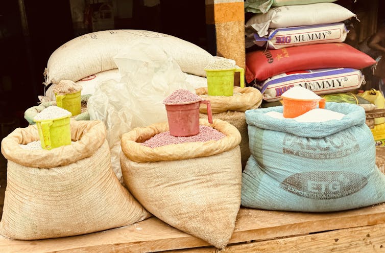 Bags of grain for sale at a market in Sierra Leone in May 2023.