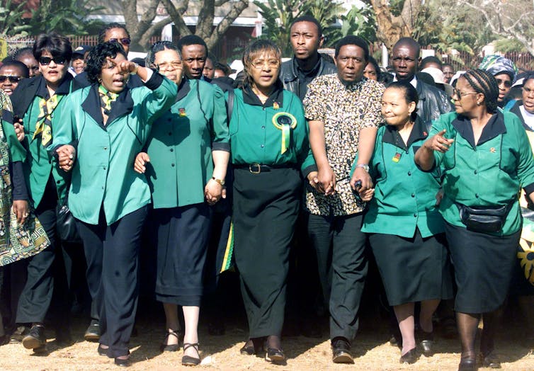 Wife of the late former South African President Nelson Mandela, Winnie Madikizela Mandela (centre), led a march during a ‘Women’s Day’ rally in Pretoria in 2000.