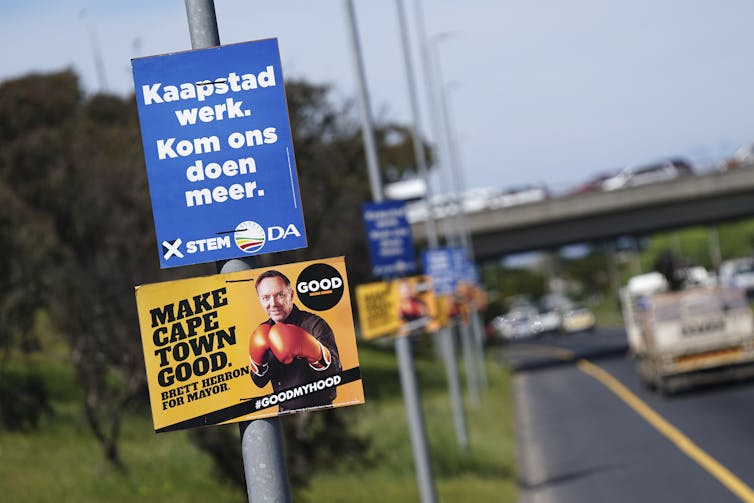 Election posters on street poles in Cape Town. The top one in Afrikaans says ‘Cape Town Works. Let’s do more’.