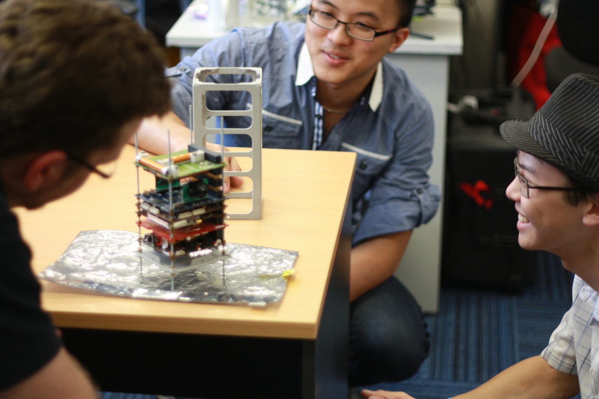 Researchers with their cubesat in development at the Australian Centre for Space Engineering Research at UNSW.