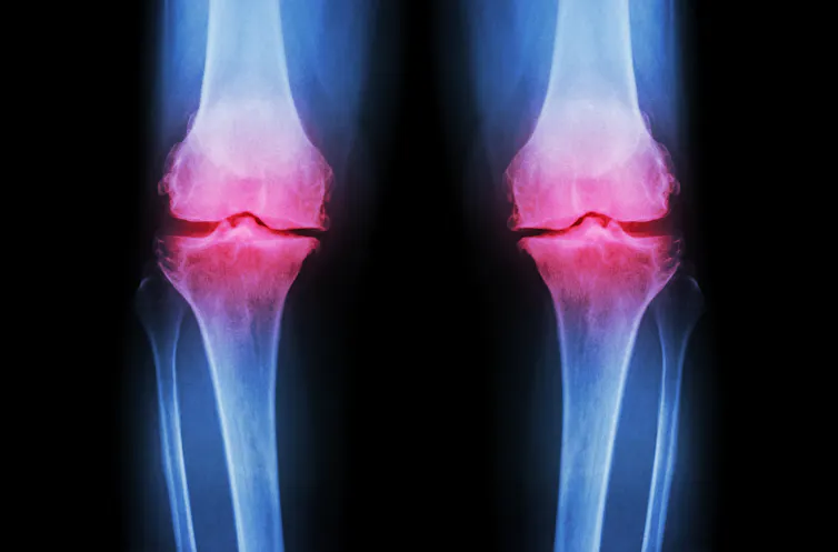 An X-ray of both knees reveals a narrow space between joints caused by loss of cartilage.