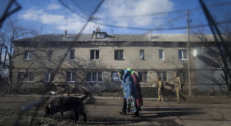 Two Ukrainian soldiers patrol a street as elderly women walk past a house damaged by artillery shelling in Novoluhanske in eastern Ukraine on Feb. 23, 2022.