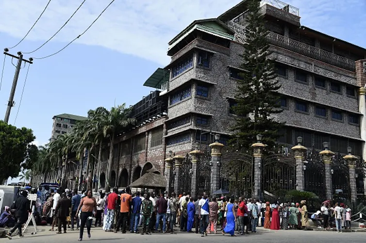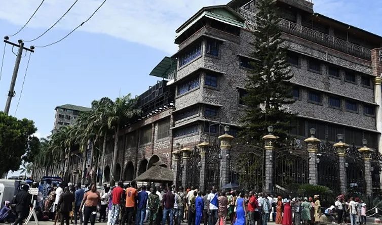 Residents and church members gather at the main gate of the Synagogue Church of All Nations headquarters in Lagos to mourn the death of pastor TB Joshua.