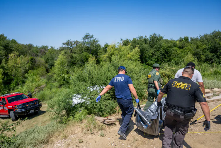 Maverick County Sheriff’s Office Deputy Sgt. Aaron Horta, EMT operators and Border Patrol officers carry a body out of a canal on June 28, 2023, in Eagle Pass, Texas.