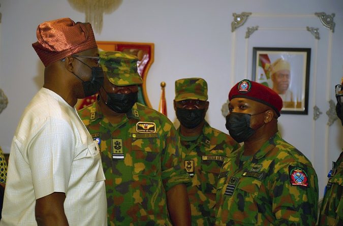 From left, Oyo State Governor, Seyi Makinde; Arc Via Officer Commanding, Logistic Command, Ikeja, Lagos of Nigeria Air Force, Air Vice Marshal Charles Ohwo and Commanding Officer, 671 Ibadan, Air Commodore Simon Peter during a courtesy visit to Governor’s Office, Secretariat, Ibadan. PHOTO: Oyo State Govt.