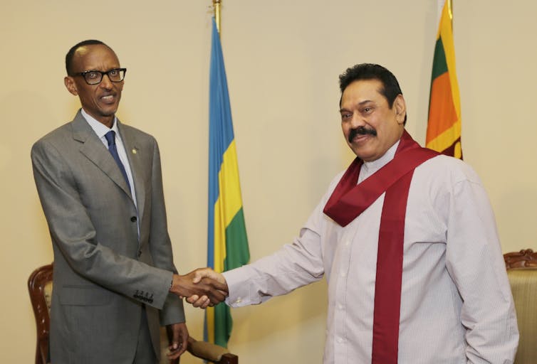 Sri Lankan Prime Minister Mahinda Rajapaksa (right) shakes hands with Rwandan President Paul Kagame (left) at the Commonwealth summit in Colombo, Sri Lanka in 2013.