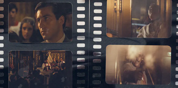 In this scene (spoiler alert: this clip contains the last scene), Michael is at the baptism of his nephew – he is the godfather – while, at the same time, the heads of five rival mafia families are being executed on his orders.