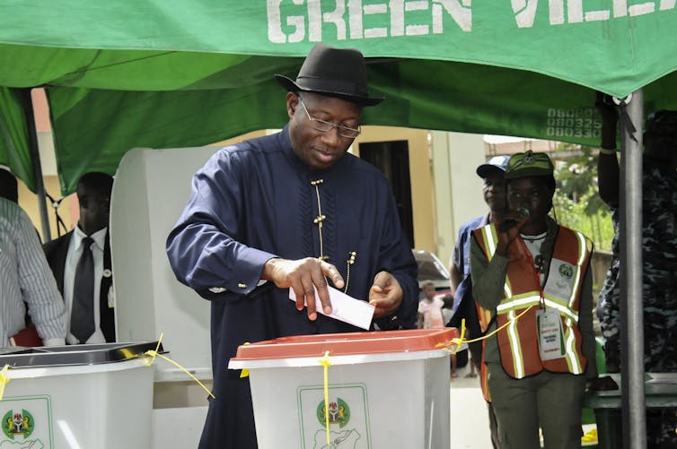 Nigeria’s ex-President Goodluck Jonathan casts his ballot in a local election.