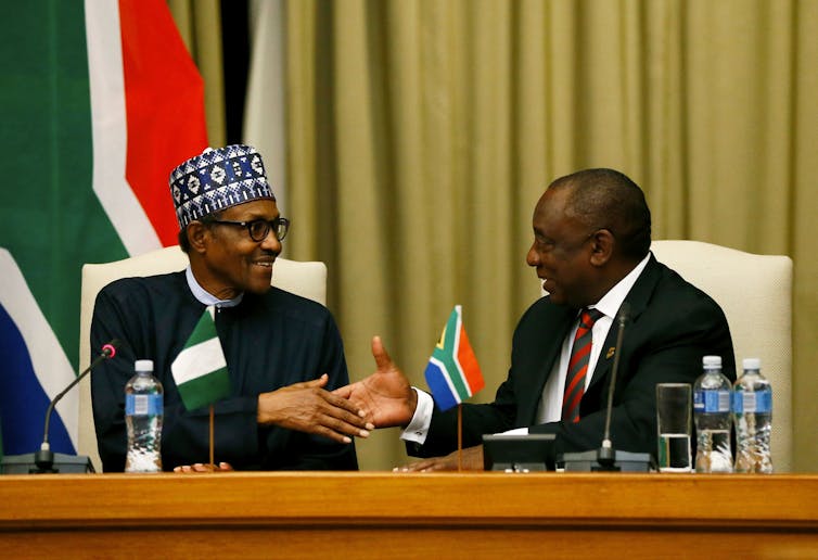 Nigeria’s President Muhammadu Buhari (L) and South Africa’s President Cyril Ramaphosa perhaps need to extend their hand shakes into the outer space.