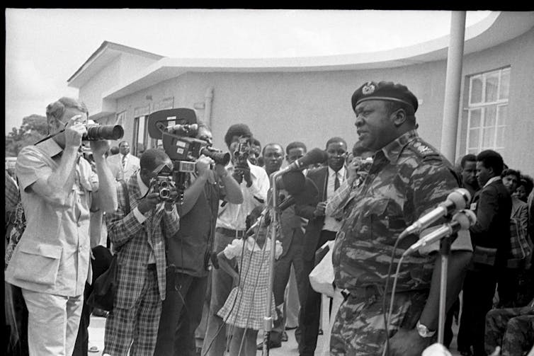 Idi Amin at a press conference in Jjaja Marina, Uganda in July 1975.