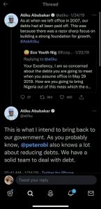A commenter further posted a tweet posted by Atiku Abubakar himself in 2019, where he prophesied the coming in of Peter Obi to reduce debts as his expertise in that sector is unparalleled.