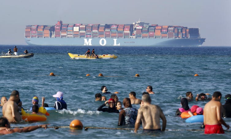 Beachgoers near Cairo watch a massive container ship sail to the Red Sea.