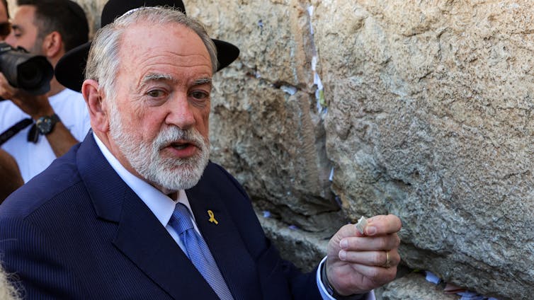 Mike Huckabee, the U.S. ambassador to Israel, holds a note given to him from President Donald Trump to be placed in the cracks of the Western Wall in the old city of Jerusalem on April 18, 2025.